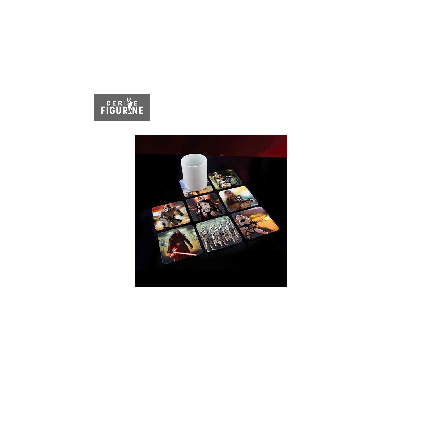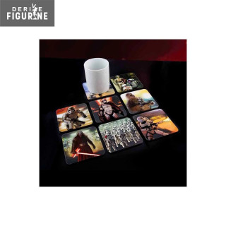 Set dessous de verre Star Wars représentant différents personnages qui mesurent environ 10 centimètres de haut. Le fabricant est Paladone.