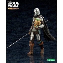 Figurine officielle de Mandalorian et Grogu en PVC mesurant environ 18 centimètres de haut, à l'échelle 1/10. Elle est issue de la collection ARTFX. Le fabricant est Kotobukiya.