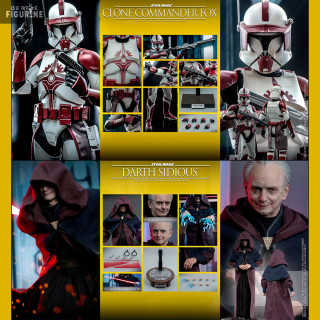 Figurine officielle au choix entre Clone Commander Fox (~ 30 cm) ou Dark Sidious (~ 29 cm), à l'échelle 1/6. Le fabricant est Hot Toys.