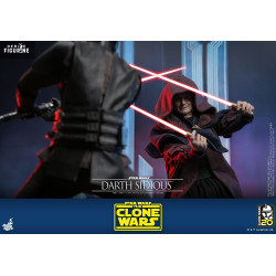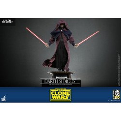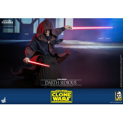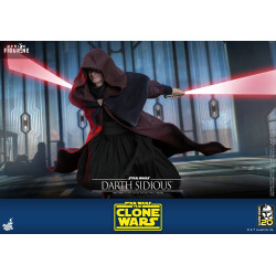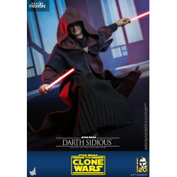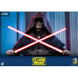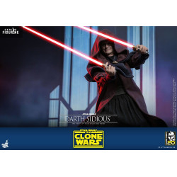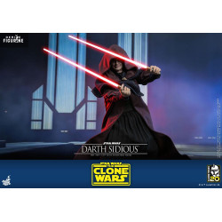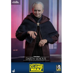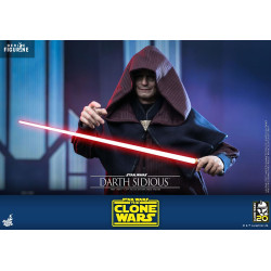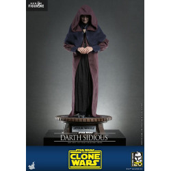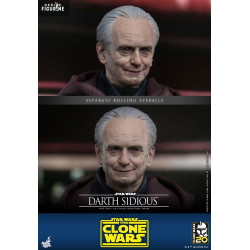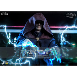 Figurine officielle de Dark Sidious mesurant environ 29 centimètres de haut, à l'échelle 1/6. Le fabricant est Hot Toys.