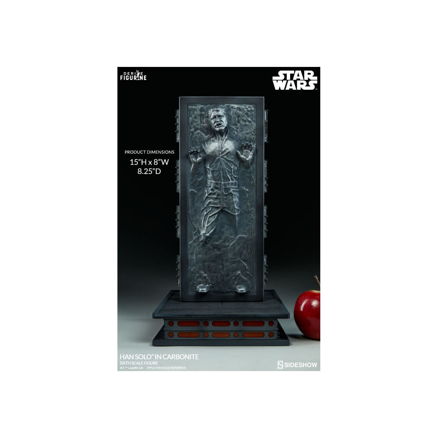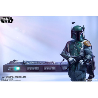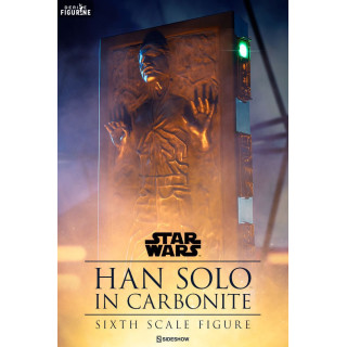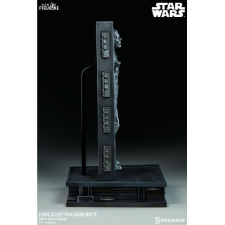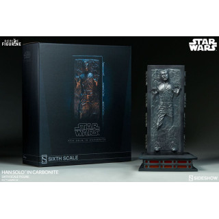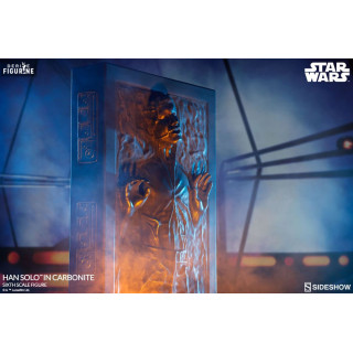 Figurine officielle de Han Solo in Carbonite mesurant environ 38 centimètres de haut, à l'échelle 1/6. Le fabricant est Sideshow Collectibles.