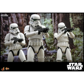 La figurine s'élève, imposante, dans une posture prête au combat, capturant le moindre détail des Stormtroopers tel que présenté dans les films originaux. L'armure éclatante, le blaster E-11 à la main, chaque élément est reproduit avec une précision qui ravira les fans et les collectionneurs. Hot Toys, réputé pour sa minutie dans la reproduction des détails de costume, a encore une fois dépassé les attentes avec cette figurine.