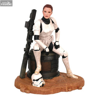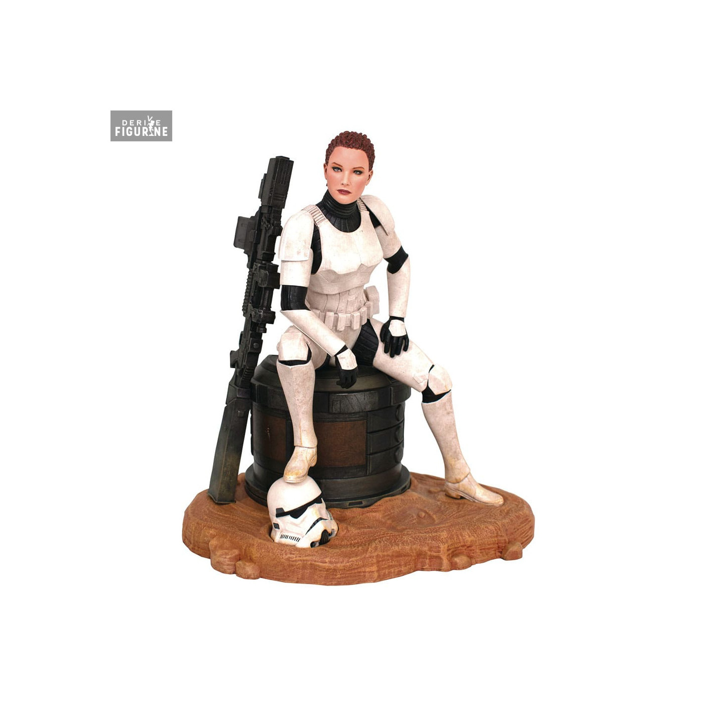 Jes Gistang est connue comme l'un des membres les plus redoutables de l'escadron de stormtroopers, portant son armure avec une fierté et une compétence qui la distinguent de ses pairs. En tant que soldat d'élite, elle est équipée pour affronter les ennemis de l'Empire avec une combinaison de force brute et de stratégie. Cette figurine la montre assise avec confiance sur une caisse d'équipement, son casque de stormtrooper reposant à ses pieds, symbolisant sa préparation au combat et sa détermination inébranlable.