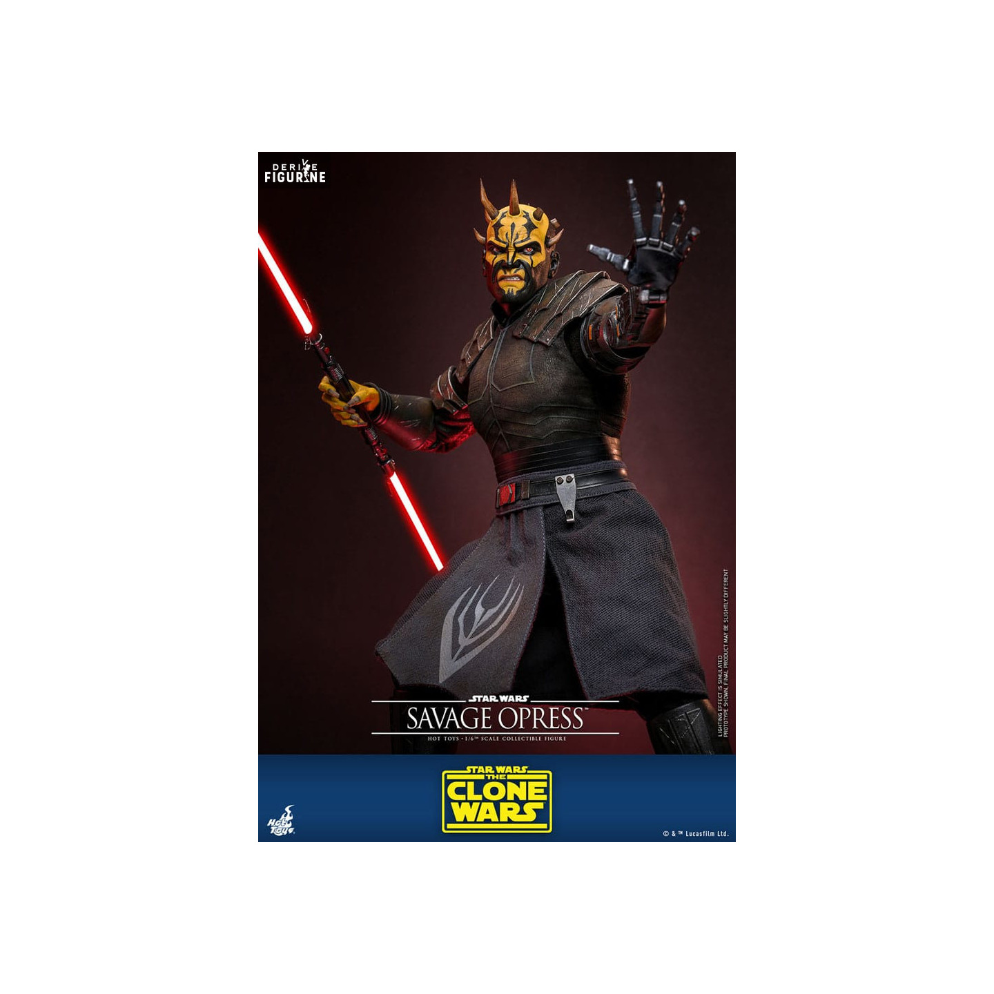 Cette figurine de Savage Opress, réalisée par le fabricant Hot Toys, mesure environ 34 centimètres et est à l’échelle 1/6, ce qui en fait un modèle impressionnant par sa taille et son niveau de détail. Conçue en PVC de haute qualité, cette pièce capture fidèlement l'apparence redoutable du personnage avec ses cornes interchangeables et plusieurs visages qui permettent de représenter différentes expressions menaçantes. La figurine inclut également des accessoires emblématiques comme le sabre laser rouge, équipé d’un effet lumineux LED, pour recréer les scènes de combat épiques de la série. De plus, la figurine est accompagnée d’un socle personnalisé avec le logo de Star Wars, apportant une touche d’authenticité pour les collectionneurs et les fans.