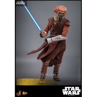 Figurine officielle de Plo Koon mesurant environ 31 centimètres de haut, à l'échelle 1/6. Elle est issue de la collection Movie Masterpiece. Le fabricant est Hot Toys.