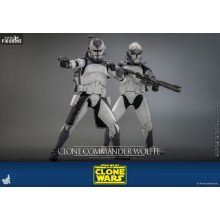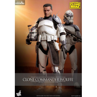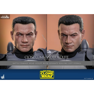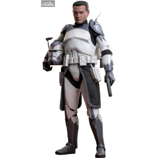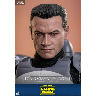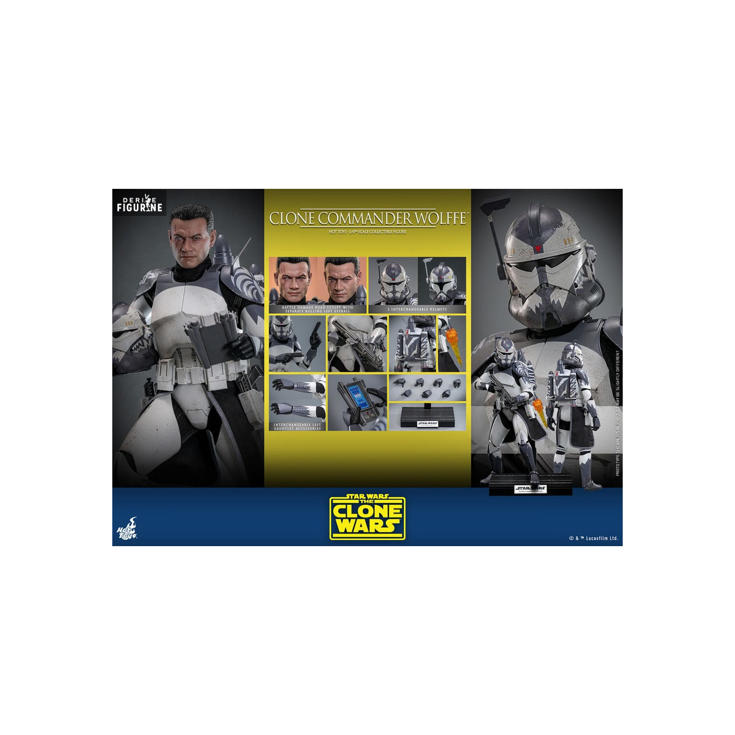 Figurine officielle de Clone Commander Wolffe mesurant environ 30 centimètres de haut, à l'échelle 1/6. Le fabricant est Hot Toys.