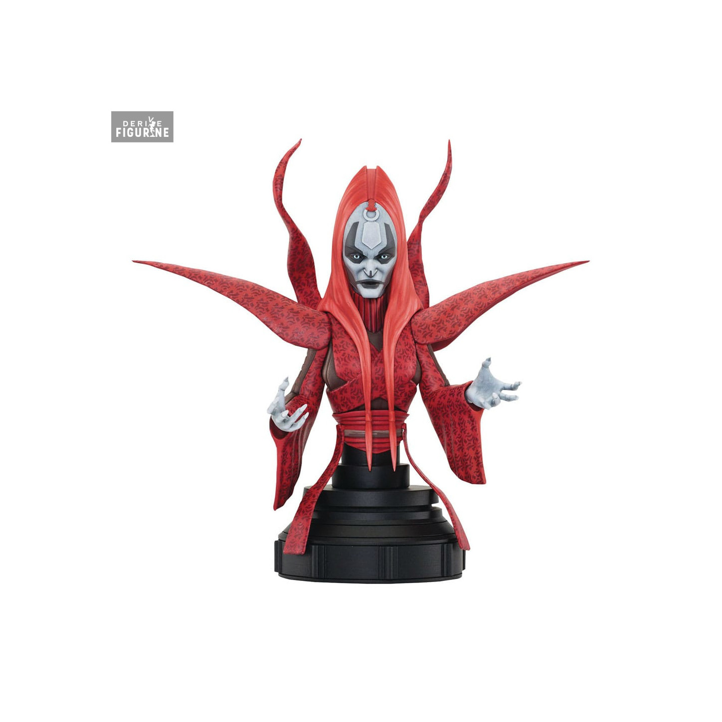 Mother Talzin, chef spirituelle et redoutable des Sœurs de la Nuit sur Dathomir, est connue pour sa maîtrise exceptionnelle de la magie noire et son rôle crucial dans les intrigues galactiques. Ce buste la représente avec précision, dans sa robe rouge emblématique, ornée de motifs délicats, et ses larges manches évoquant ses pouvoirs mystiques. Les détails de son visage, avec ses traits marqués et son regard perçant, reflètent à merveille sa nature mystérieuse et autoritaire.