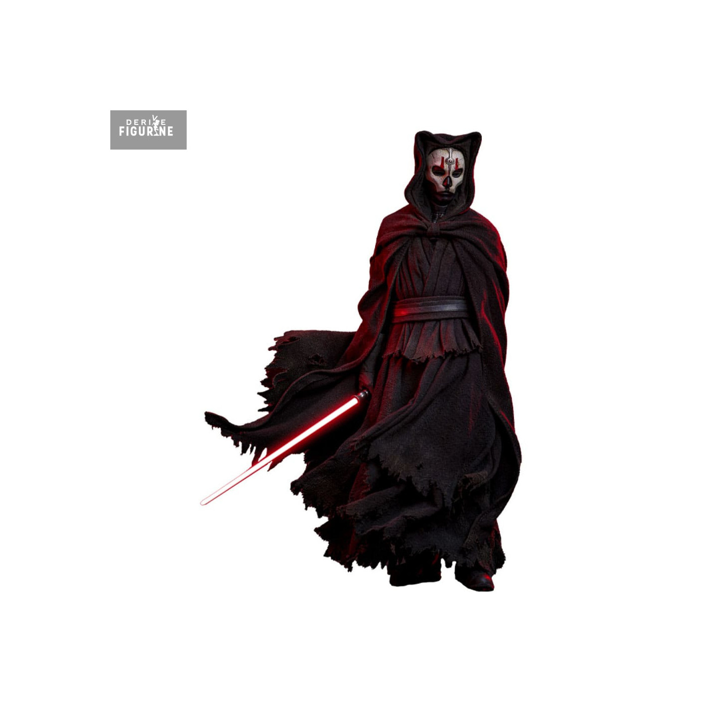Cette figurine officielle à l’échelle 1/6 signée Hot Toys capture parfaitement cette aura de néant. Haute de 31 cm, elle impose par sa stature, mais surtout par son atmosphère. Le masque blanc fendu de rouge semble flotter, détaché d’un corps que la cape noire effilochée vient engloutir. Le sabre rouge s’illumine à peine, presque secondaire face à la menace silencieuse qu’il incarne.