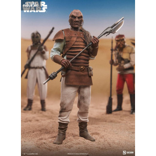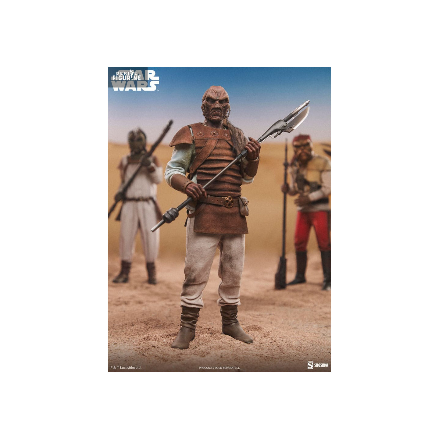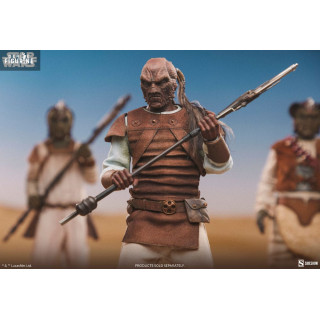 La tenue de Pagetti se compose d’un corsage en tissu texturé, d’un plastron en faux cuir vieilli et d’un pantalon ajusté aux tons sable, évoquant les étendues désertiques de Tatooine où elle a joué un rôle clé. Chaque couche de tissu est patinée pour simuler l’usure du combat et les brûlures de la Force, tandis que les coutures et les surpiqûres sont reproduites avec un réalisme saisissant. Les gantelets et les brassards sculptés en PVC dur accentuent son allure guerrière et protègent les articulations sans compromettre la pose.