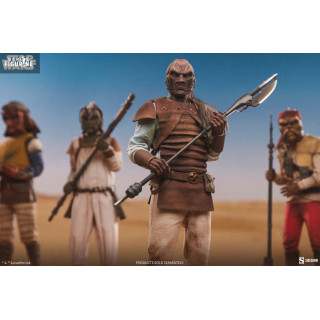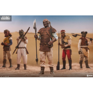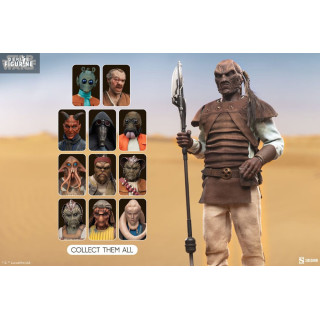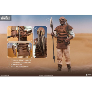 Côté accessoires, Pagetti Rook est livrée avec quatre mains interchangeables : deux paires conçues pour agripper fermement son vibrospear, et deux autres, plus détendues, pour varier les attitudes. Le vibrospear, pièce maîtresse de la figure, propose une lame à double tranchant dont le métal brossé capte la lumière de façon réaliste. Un socle thématique estampillé du logo Sideshow Collectibles complète l’ensemble, permettant une mise en scène stable et élégante.