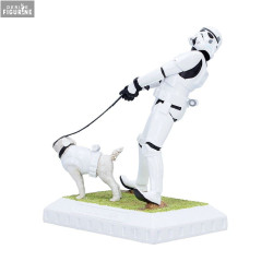 Réalisée en résine, la scène repose sur un socle évoquant un sol herbeux parsemé de plaques métalliques. Le Stormtrooper, fidèle à son design d’origine, est représenté en train de tirer sur la laisse, le buste légèrement penché vers l’arrière, traduisant la résistance du chien. Ce dernier porte lui aussi une armure, avec harnais et museau noir, clin d’œil canin à l’uniforme impérial.