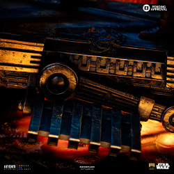 Visuellement, le diorama repose sur une base de roches noircies et de lave translucide orange, avec des flammes sculptées qui jaillissent autour d’une plate-forme mécanique flottante. Anakin porte sa tenue sombre, tunique et bottes brunes, cheveux en bataille, en pleine attaque le corps projeté vers l’avant. En face, Obi-Wan est sculpté dans sa robe beige et son armure légère, les pieds solidement ancrés, sabre tenu en garde. Les détails de l’armature du pont, des câbles et des plaques métalliques complètent la scène, et la base large garde l’ensemble bien stable dans une vitrine.