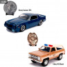 Figurines officielles de Chevy Camaro Z28 + pièce de Billy ou Chevy K5 Blazer de Hopper + badge en die cast, à l'échelle 1/24. Le fabricant est Jada Toys.