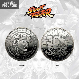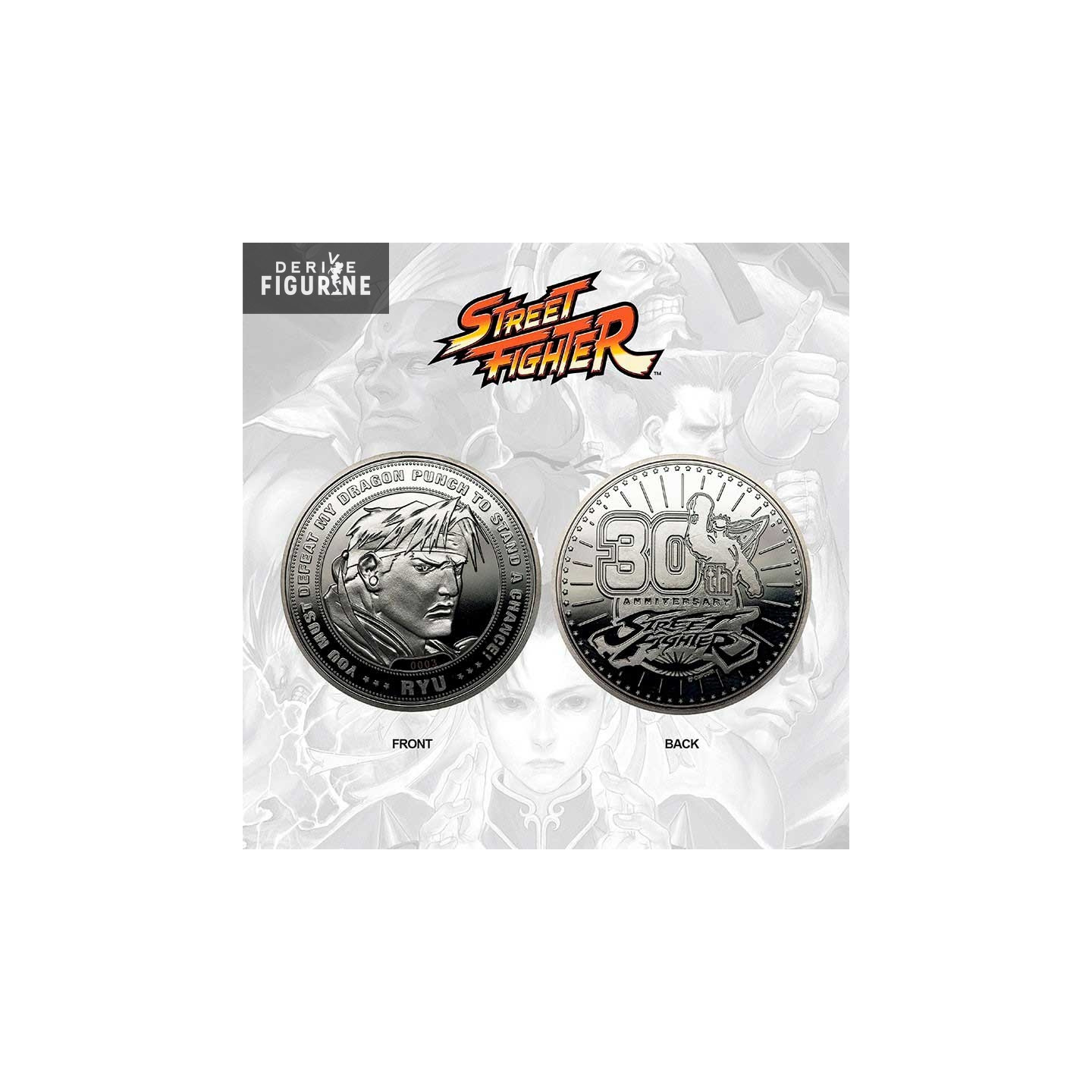 Une pièce en argent collector avec d'un côté Ryu et de l'autre, le logo pour fêter les 30 ans de la franchise Street Fighter.