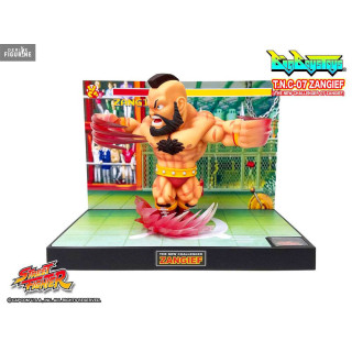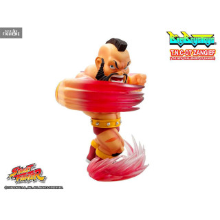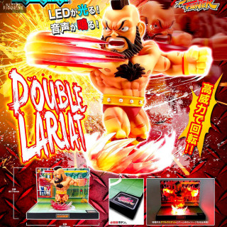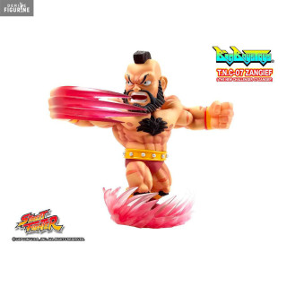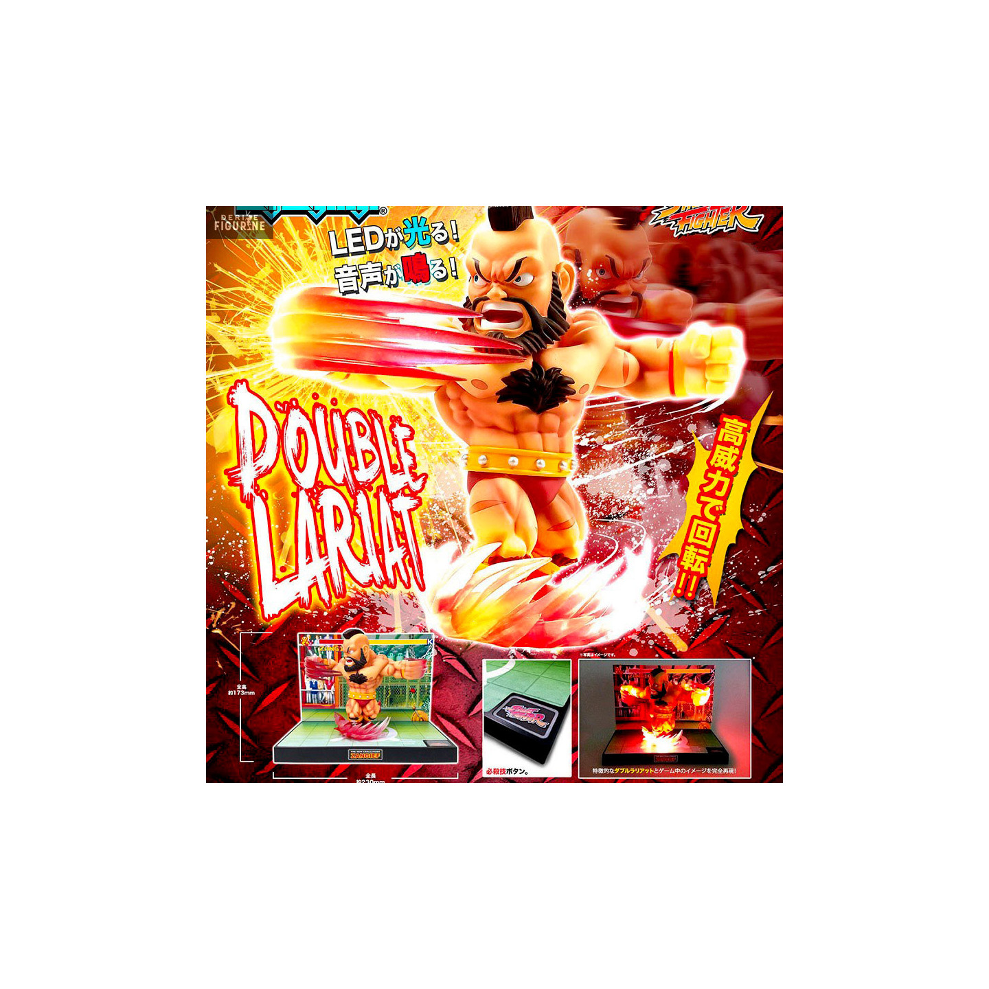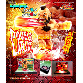 Soyez très prudent car voici venu Zangief. Ce mastodonte s'est entraîné en combattant des ours à mains nues en Sibérie (on peut d'ailleurs voir quelques cicatrices sur son corps). Il travaille aussi pour le gouvernement soviétique, mais ici, c'est pour un combat dans Street Fighter qu'il est venu. Cette figurine est non seulement lumineuse, mais aussi sonore. Pour cela, vous aurez besoin trois piles AAA (non incluses).