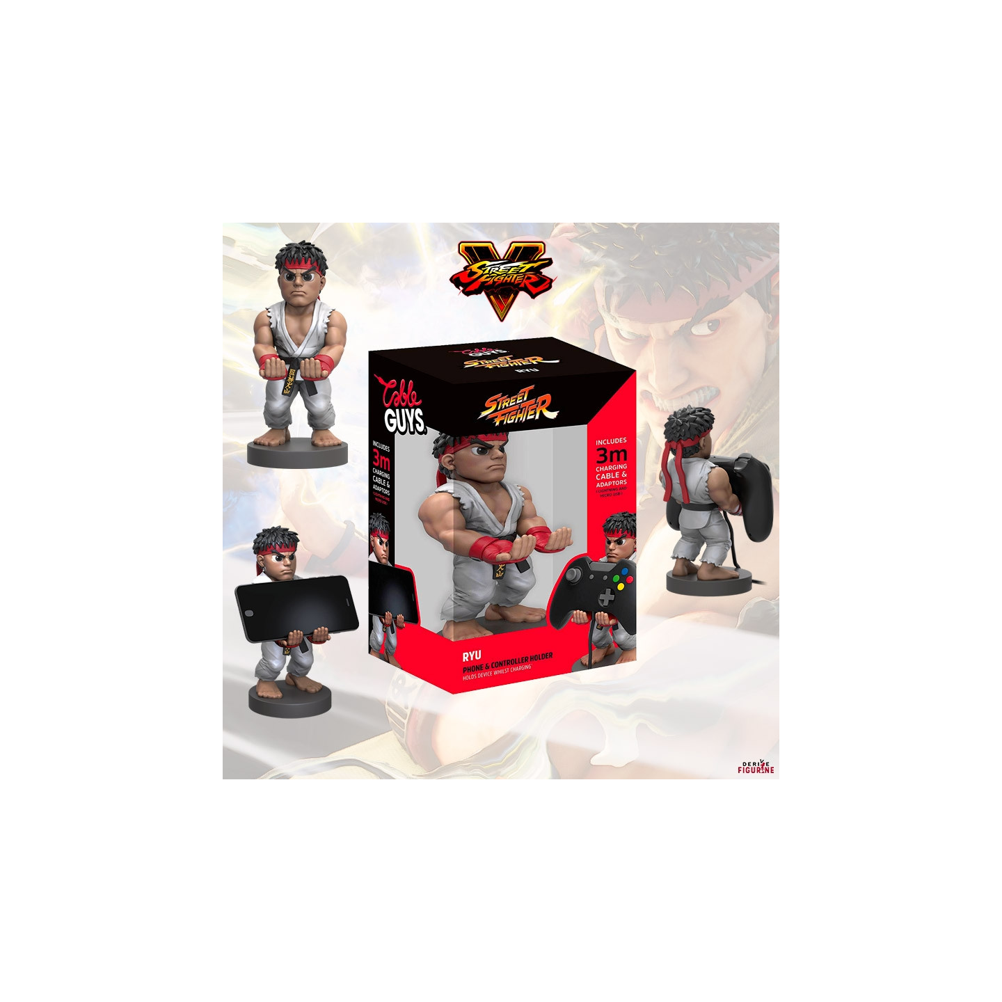 Cable Guys officiel de Ryu mesurant environ 20 centimètres de haut. Il est livré avec un câble micro-USB de 3 mètres et un adaptateur Lightnig. Le fabricant est Exquisite Gaming.