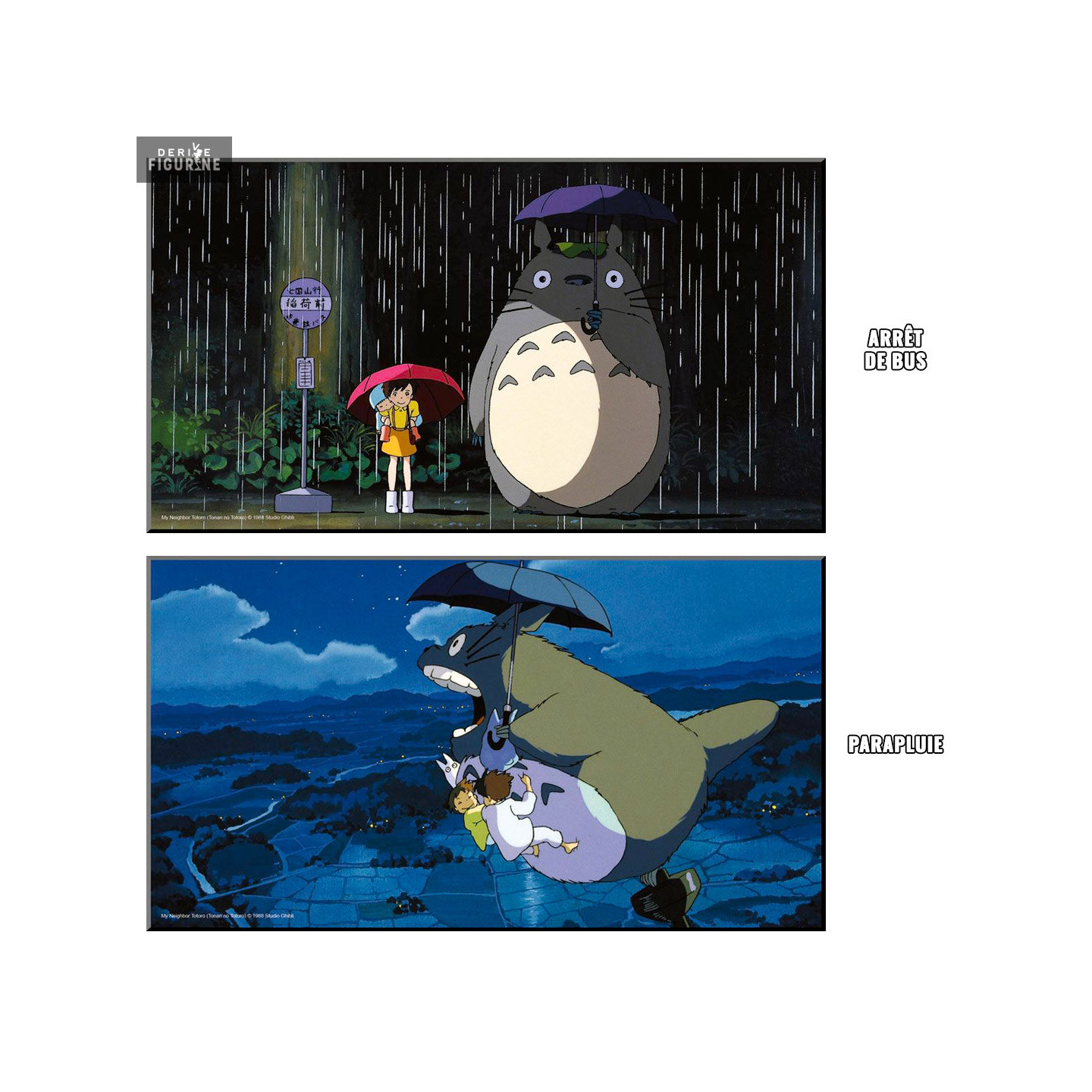 Vous avez le choix entre deux magnifiques tableaux de l'univers de Studio Ghibli et du film Mon Voisin Totoro avec deux scènes différentes. Ainsi, vous pouvez choisir entre la scène de l'arrêt de bus ou Totoro attend en compagnie de Satsuki et Mei ou bien alors, la version Parapluie où Totoro s'envole avec les deux fillettes dans le ciel !