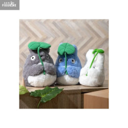 Peluche officielle de Big Totoro with leaf, Nakayoshi en 100% polyester mesurant environ 21 centimètres de haut. Le fabricant est Sun Arrow.