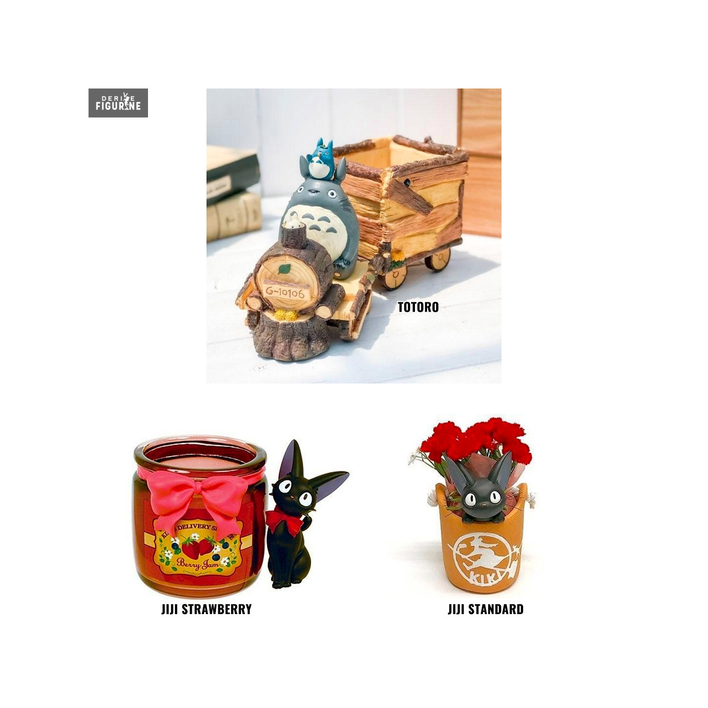 Que ce soit pour exposer sans fleurs ou avec ou pour mettre quoi que ce soit à l'intérieur, ces figurines sont clairement de toute beauté et font honneur aux œuvres du Studio Ghibli. Plusieurs choix s'offrent à vous avec deux version pour Jiji la Sorcière, standard ou Strawberry et une version de Mon Voisin Totoro avec le train de Totoro.