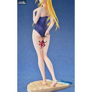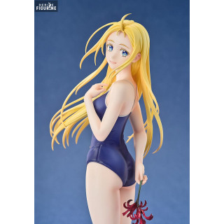 Ushio Kofune, l'un des personnages principaux de "Summer Time Rendering", est ici représentée dans une posture élégante et détendue, capturant parfaitement son charme et sa beauté naturelle. Elle est vêtue d'un maillot de bain une pièce bleu marine, un choix vestimentaire qui met en valeur sa silhouette gracieuse. Ushio tient délicatement une fleur rouge, ajoutant une touche de douceur et de mystère à l'ensemble.