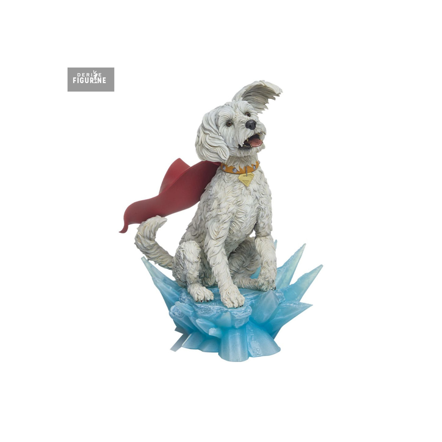 Le design de cette édition Premium Format le montre assis, cape au vent, sur un socle cristallin bleu évoquant un jaillissement d’énergie glaciale. Sa fourrure texturée, finement ciselée, reproduit fidèlement les ondulations naturelles d’un chien en pleine action. Le collier doré, orné d’un médaillon en forme de « K », et la cape rouge emblématique soulignent son statut de super-héros à quatre pattes.