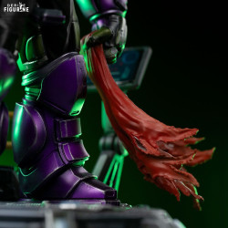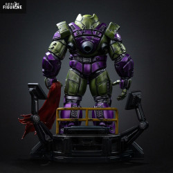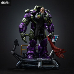 Les détails de l’armure sont d’une grande précision : plaques articulées, câblages apparents, et peinture métallisée qui accentue les reflets du métal. Les écrans latéraux, les plateformes techniques et les touches de bleu et rouge ajoutent un contexte visuel futuriste. La sculpture donne une impression de poids et de puissance, accentuée par la posture immobile de Luthor.