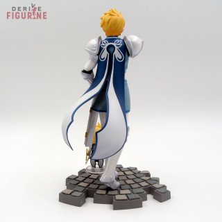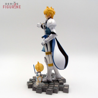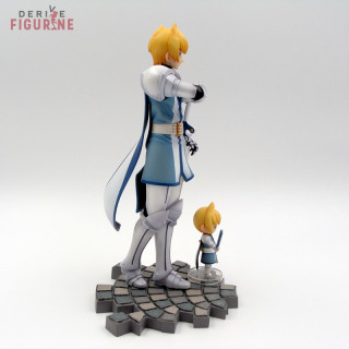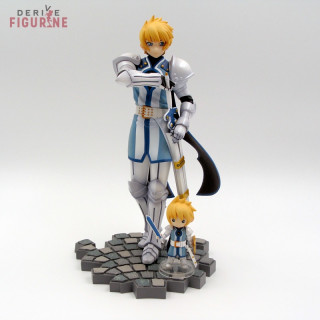 Figurines d'occasion et officielles de Flynn Scifo et sa chibi en PVC d'environ 22 et 5,5 centimètres de haut à l'échelle 1/8. Contient tous les accessoires. Il s'agit d'objets d'occasion en parfait état, mais le bouclier de la chibi est cassé. Le fabricant est Alter, vendu avec boîte en assez mauvais état, un peu cabossée voire déchirée par endroits.