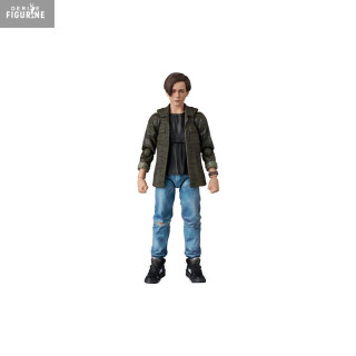 Ces MAFEX capturent fidèlement l’esthétique iconique des personnages : l’armure endommagée du T-800 révèle le métal sous la peau synthétique, tandis que sa posture massive et son fusil à pompe témoignent de sa puissance brute. John porte sa tenue décontractée — veste kaki, tee-shirt sombre et jean usé — et ses traits juvéniles sont sculptés avec justesse, reflétant à la fois vulnérabilité et courage.