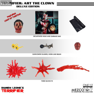 Figurine officielle de Art the Clown, Deluxe Edition avec vêtements en tissu mesurant environ 17 centimètres de haut, à l'échelle 1/12. Elle est issue de la collection One:12. Le fabricant est Mezco Toys.