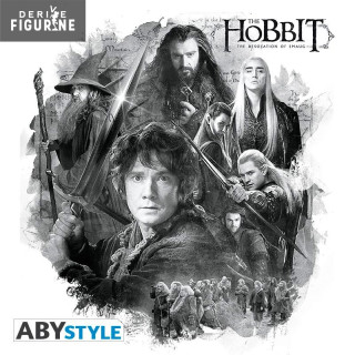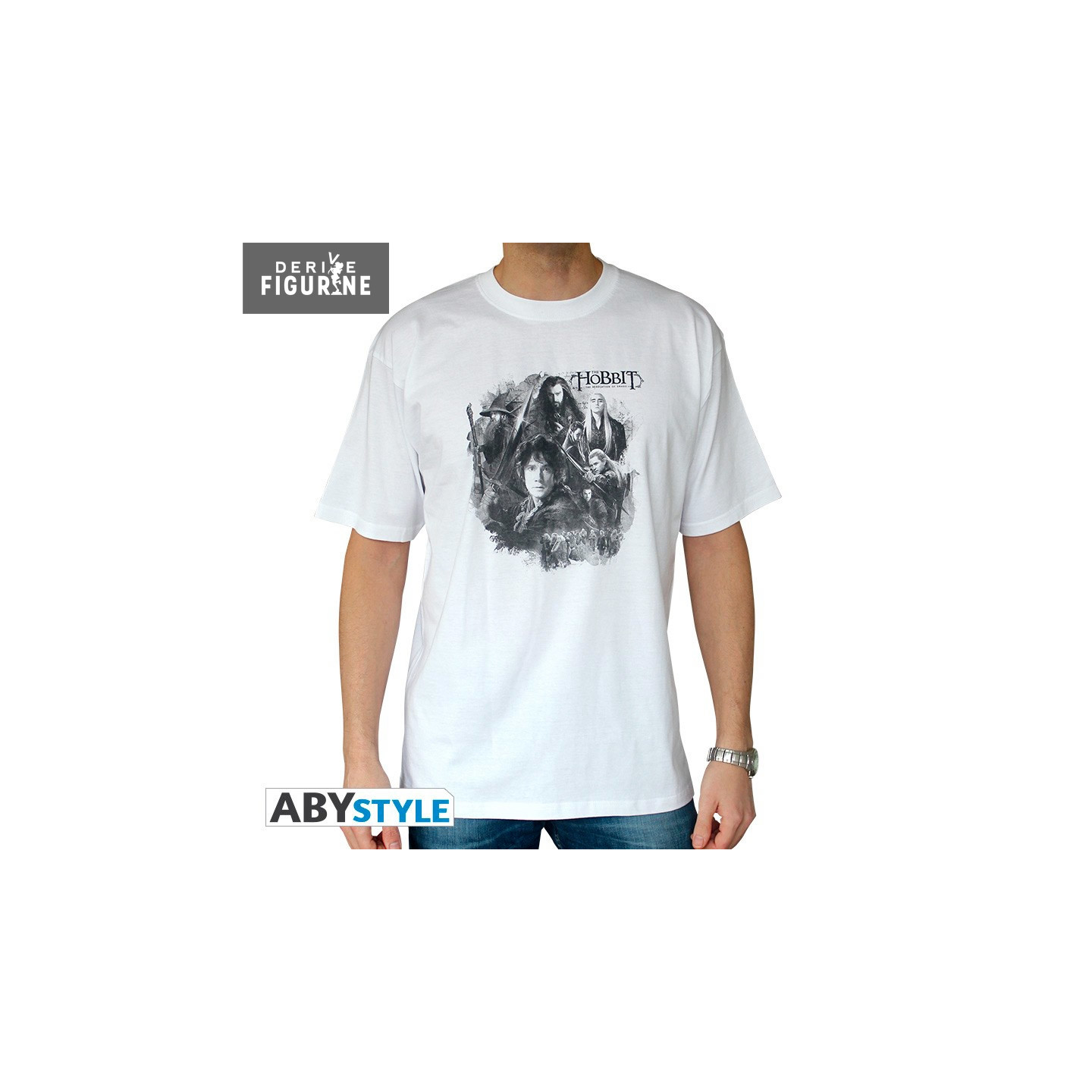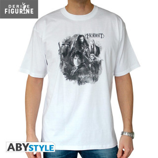 Les fans du Hobbit vont pouvoir se balader avec leurs héros préférés avec eux. On peut voir Gandalf, Bilbon, Legolas, Thauriel, le roi Thranduil et les nains de Thorin. L'image est en noir et blanc sur un t-shirt blanc.