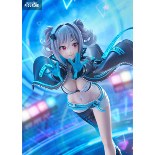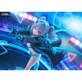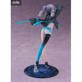 La figurine met en avant une tenue composée d’un short blanc, de bottines noires, d’un manteau noir flottant orné de détails bleus, et de bas asymétriques — un noir et un turquoise. Sa coiffure emblématique à couettes argentées est parfaitement reproduite, tout comme ses yeux violets et son expression sérieuse. Le socle circulaire représente une scène stylisée avec un effet digital qui accentue le thème de la danse et de la technologie.