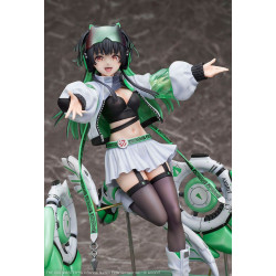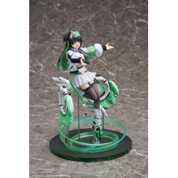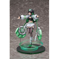 Visuellement, la figurine mise sur un ensemble très dynamique : Fuyuko porte une veste courte blanche et verte ouverte sur un top noir, avec une jupe blanche légère et une ceinture marquée au niveau de la taille. Ses longues jambes sont habillées de bas noirs et de bottines blanches et vertes posées sur un socle rond, décoré d’anneaux translucides verts qui tournent autour d’elle. Ses cheveux noirs aux pointes vertes tombent en mèches souples, surmontés d’un casque aux allures d’oreilles de chat. Tout autour d’elle, des modules mécaniques verts en forme de grandes mains flottent sur des tiges métalliques, comme des bras robotisés prêts à accompagner sa chorégraphie, ce qui donne à l’ensemble un vrai côté scène SF.