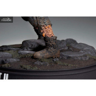 Le socle reproduit un sol jonché de débris et de gravats, gravé du logo The Last of Us Part II, renforçant l’atmosphère oppressante de la scène. Chaque fissure, chaque nervure fongique et chaque trace de saleté sur ses bottes contribuent à un rendu saisissant pour les amateurs de figures d’inspiration horreur.