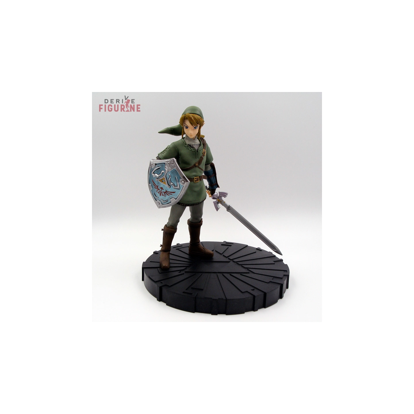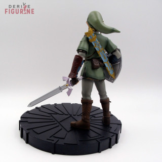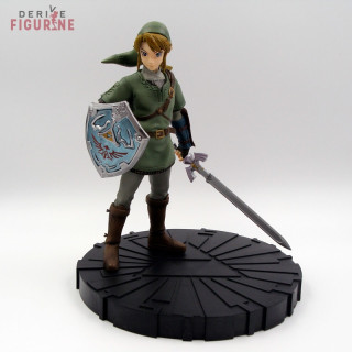 Figurine d'occasion et officielle de Link en ABS/PVC d'environ 25,5 centimètres de haut. Link se tient sur son socle à l'image de la Triforce avec son épée et son bouclier. Il s'agit d'un objet d'occasion en bon état avec un petit endroit manquant de peinture (photo). Le fabricant est Together Plus, vendu avec boîte en assez bon état.