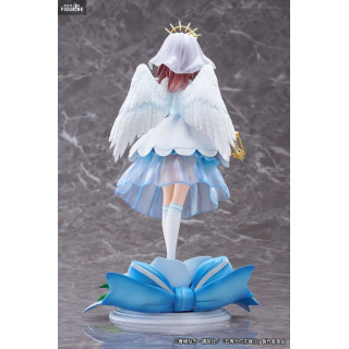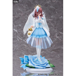 La figurine représente Miku vêtue d'une robe blanche et bleue, évoquant la pureté et l'innocence. Les détails de sa tenue sont délicatement sculptés, des volants de sa robe translucide aux ailes angéliques déployées dans son dos. Son visage exprime une douceur sereine, renforcée par la couronne dorée qui orne sa tête. Elle tient une lanterne dorée, symbole de lumière et de guidance, ce qui ajoute une dimension mystique à l'ensemble.