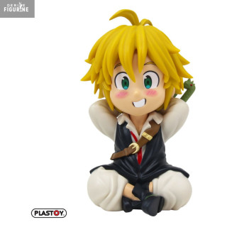 Figurine tirelire officielle de Meliodas en PVC mesurant environ 14 centimètres de haut. Le fabricant est Plastoy.
