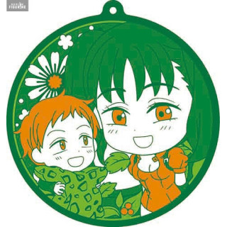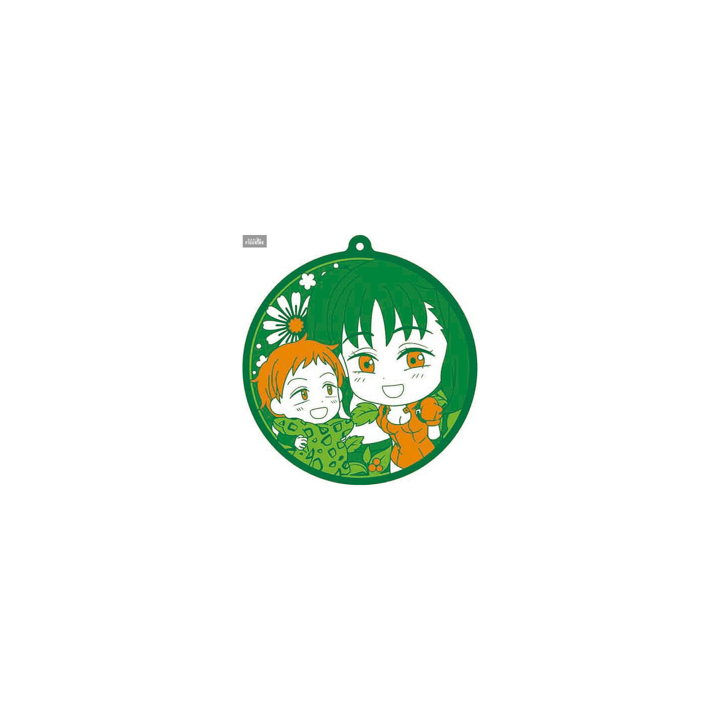 Porte-clés officiel de The Seven Deadly Sins en PVC qui mesure environ 7,5 centimètres de diamètre. Le fabricant est Banpresto. Contient uniquement le porte-clé Diane et King sur fond vert.
