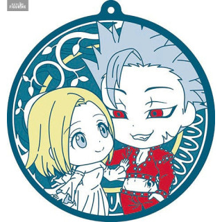 Porte-clés officiel de The Seven Deadly Sins en PVC qui mesure environ 7,5 centimètres de diamètre. Le fabricant est Banpresto. Contient uniquement le porte-clé Elaine et Ban sur fond bleu.