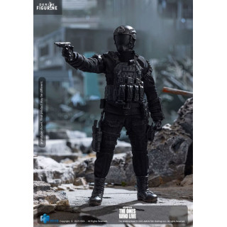 La figurine proposée ici par Hiya Toys dans la collection Exquisite Super Series le montre dans sa tenue de combat complète. 16 cm de présence, bardé d’équipement, avec une panoplie d’accessoires aussi variée qu’efficace : fusil d’assaut, pistolet, hache, sabre, bâton, différentes paires de mains et deux visages interchangeables — dont un avec le masque tactique pour les missions plus musclées.
