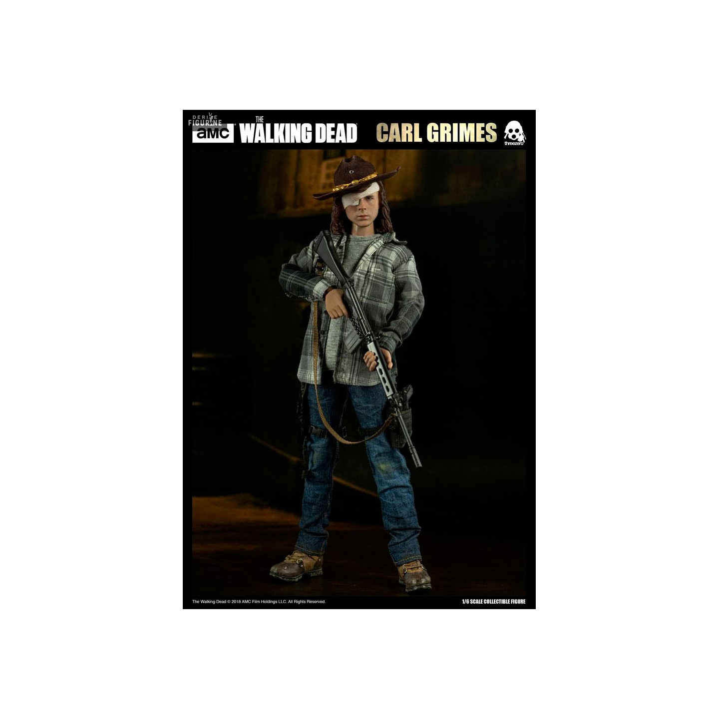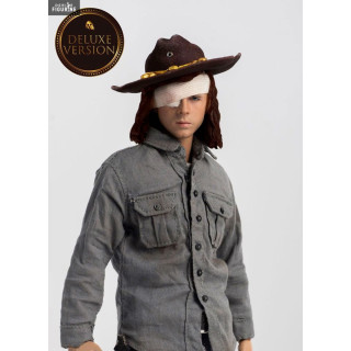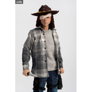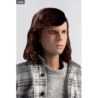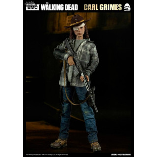 Figurine officielle de Carl Grimes mesurant environ 29 centimètres de haut, à l'échelle 1/6. Le fabricant est Three Zero.