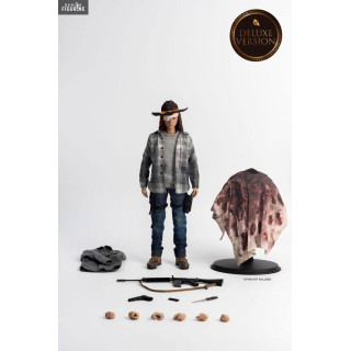 Fils de Rick et Lori, Carl Grimes est un jeune garçon faisant partie des personnages principaux de l'histoire de la série The Walking Dead et il fait également face aux célèbre et dangereux antagonistes faisant office de zombies, les rôdeurs. La version classique vous permet d'obtenir la figurine du personnage ainsi que quelques accessoires tandis que la Deluxe propose, en plus, deux accessoire bien sympathiques puisqu'il s'agit du poncho et de la chemise de Carl ce qui offre plus de possibilités à l'exposition.