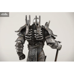 Cette figurine de 23 centimètres, conçue par Dark Horse, retranscrit parfaitement la puissance d’Imlerith. Son armure noire et argentée, couverte de pointes et de plaques épaisses, évoque un style baroque guerrier, presque infernal. Son crâne chauve marqué d’un sceau rouge et son visage fermé renforcent son apparence inhumaine. Il tient fermement sa masse ornée d’un masque grotesque, prêt à frapper sans pitié. Le socle décoré du symbole du loup vient rappeler l’univers de Geralt, offrant un contraste parfait entre héros et antagoniste.