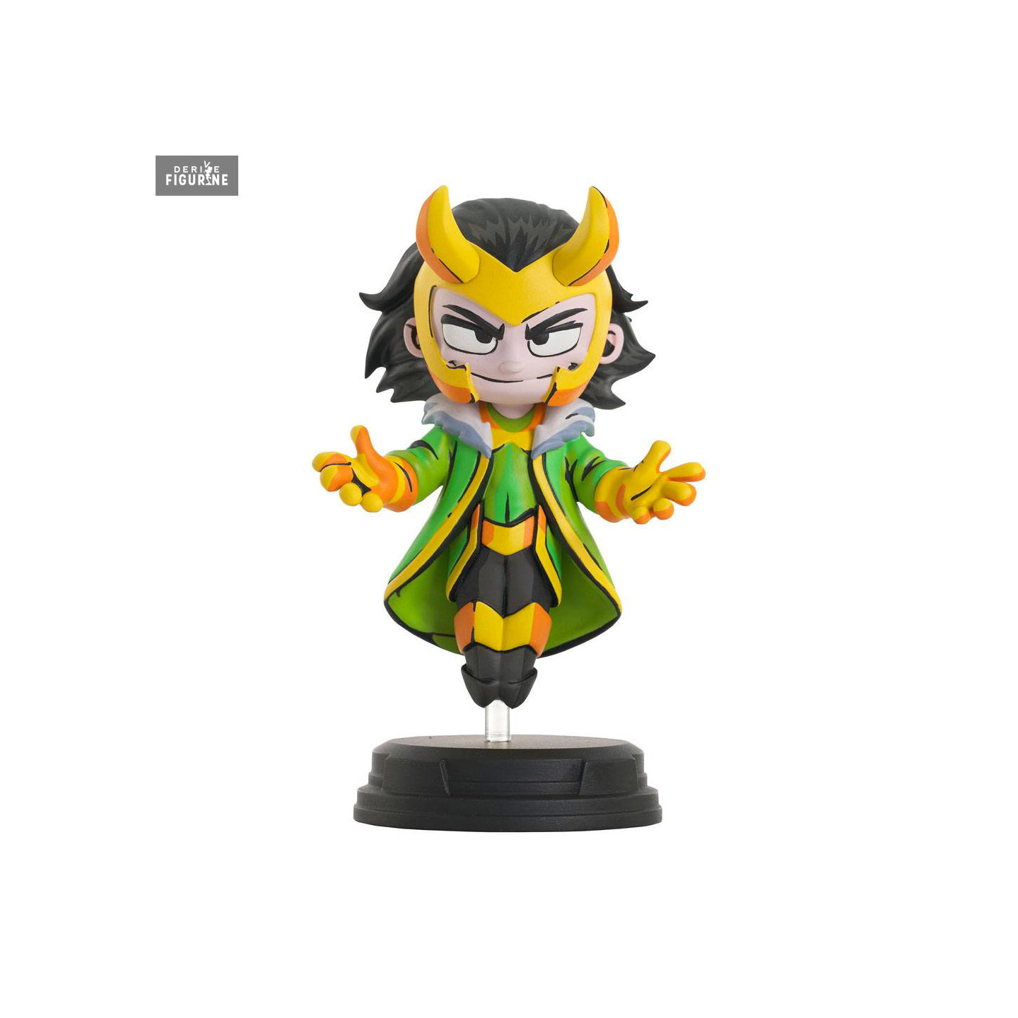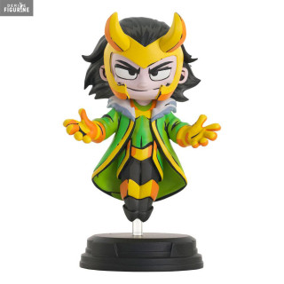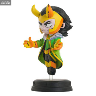 Figurine officielle de Loki en résine mesurant environ 10 centimètres de haut. Le fabricant est Diamond Select Toys.