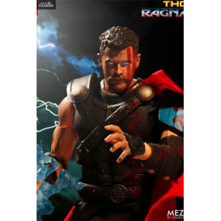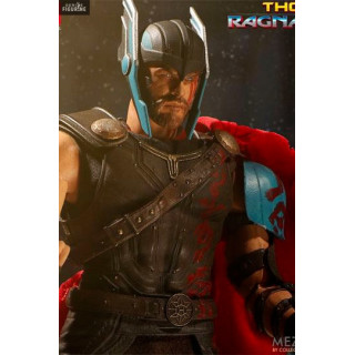 Cette figurine de Thor est basée sur le film Thor Ragnarok. Elle possède 30 points d'articulation et de nombreux accessoires. Il y a par exemple des mains et têtes de rechanges, mais aussi des armes, un bouclier, ou des éclairs. Ses vêtements sont en tissu.