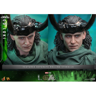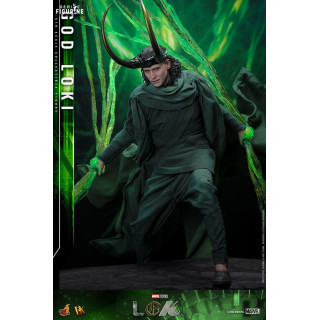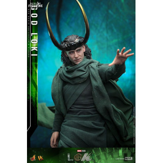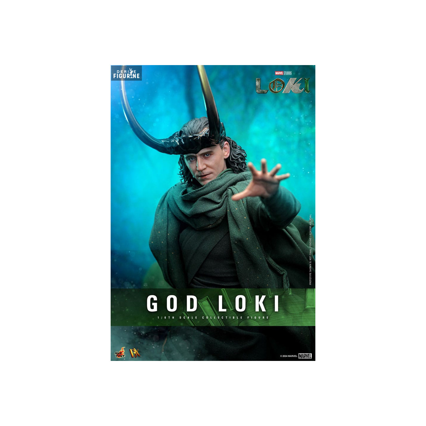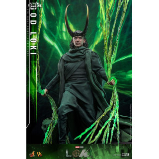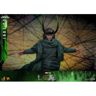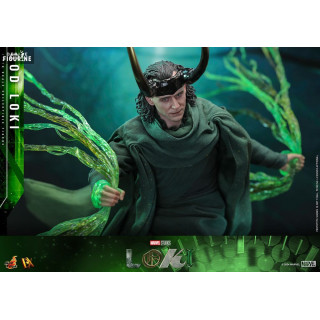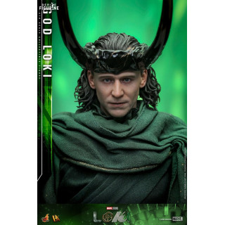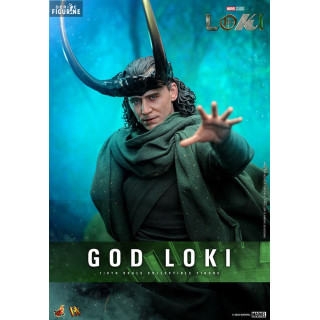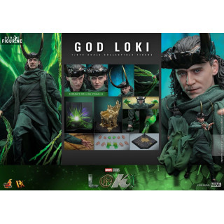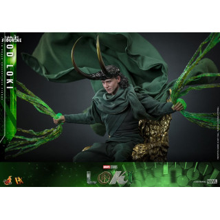 Figurine officielle de God Loki, DX mesurant environ 31 centimètres de haut, à l'échelle 1/6. Le fabricant est Hot Toys.