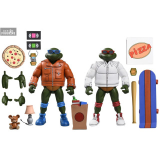 Produites par NECA, ces figurines mesurent environ 18 centimètres et sont accompagnées d’un large éventail d’accessoires, incluant des mains interchangeables, un skateboard, une batte de baseball, une boîte de pizza, des VHS et bien d’autres éléments emblématiques. Grâce à leurs multiples points d’articulation, ces figurines permettent de recréer des poses dynamiques et des scènes cultes. Un set incontournable pour les collectionneurs et les amateurs de l’univers Teenage Mutant Ninja Turtles !