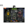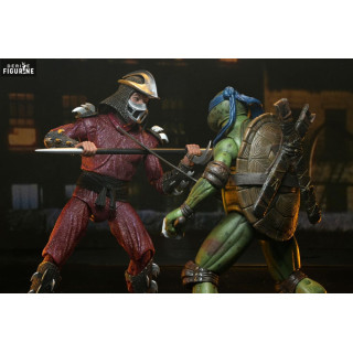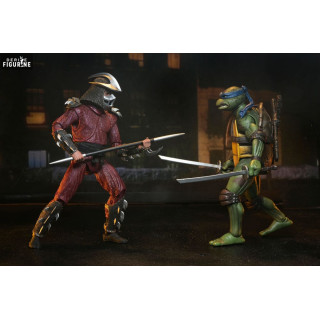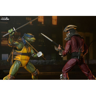 Figurines officielles de Roof Top Battle Shredder vs Leonardo mesurant environ 18 centimètres de haut. Le fabricant est NECA.