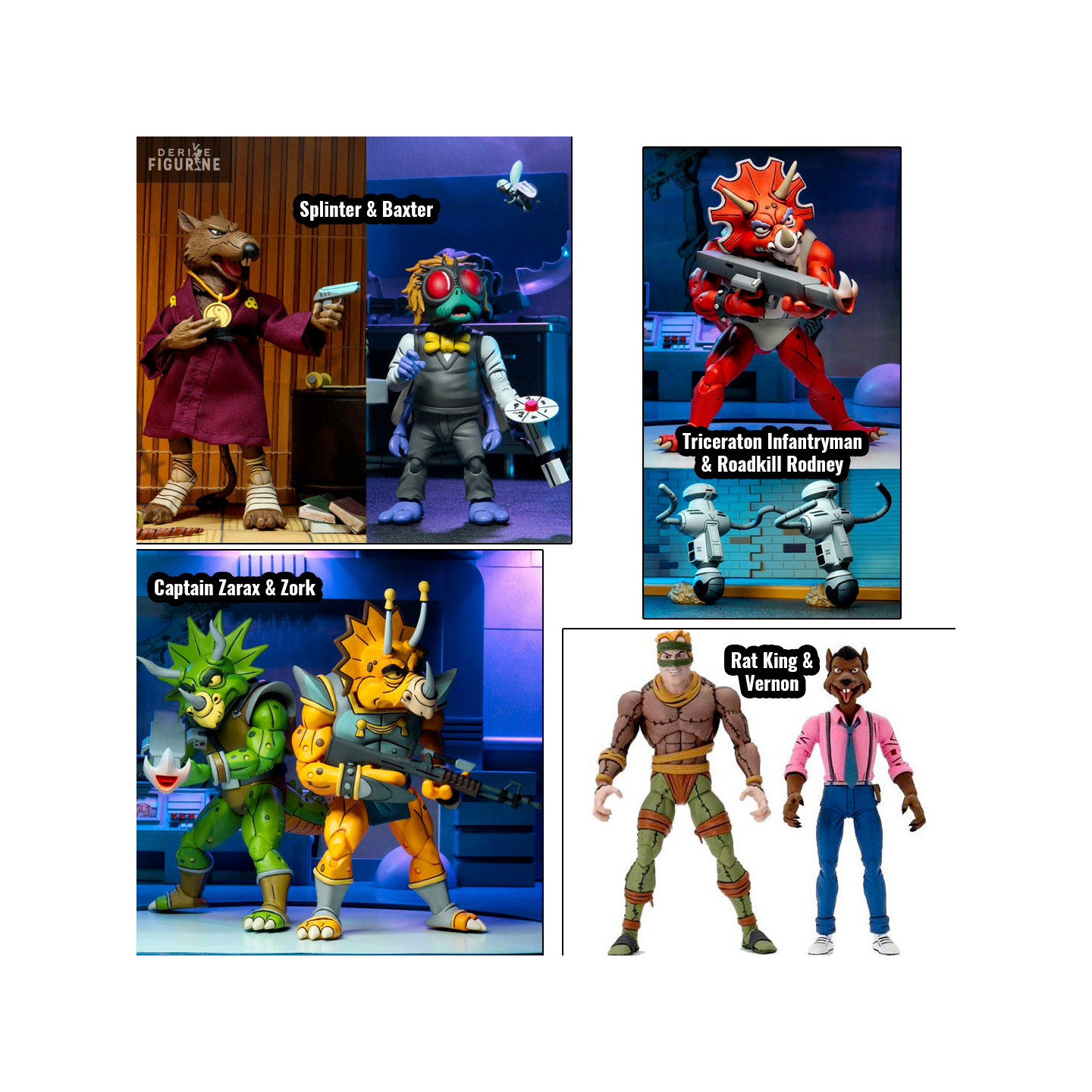 Si vous êtes un grand fan des Tortues ninja, vous allez être très heureux car nous avons quatre pack de figurines différents à vous proposer et ils sont composés de personnages que nous ne voyons pas souvent. Le premier comprend Splinter et Baxter Stockman, le second Rat King et Vernon, le troisième Captain Zarax et Zork et enfin le quatrième et dernier est composé de Triceraton Infantryman et deux Roadkill Rodney.