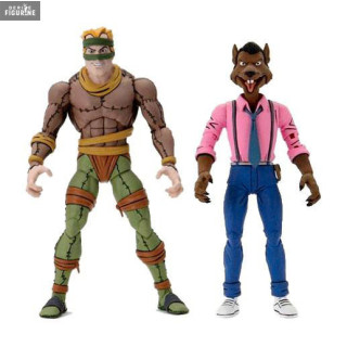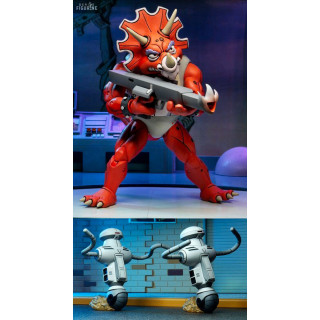 Figurines officielles au choix entre Triceraton Infantryman & Roadkill Rodney, Splinter & Baxter, Rat King & Vernon ou Captain Zarax & Zork mesurant environ 18 centimètres de haut. Le fabricant est NECA.