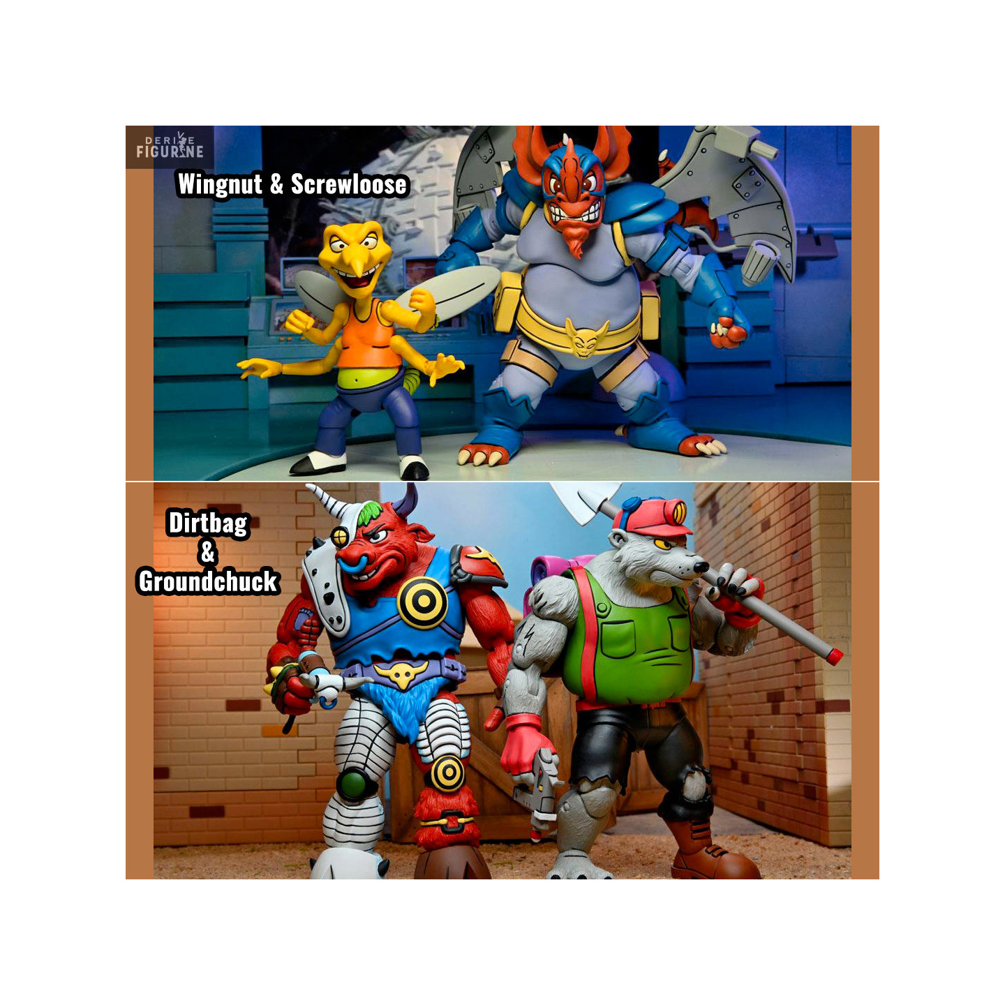 Si vous êtes un grand fan des Tortues Ninja, vous allez être aux anges car nous vous proposons deux packs, avec chacun deux personnages. Le premier est composé de Wingnut (Aile-Molle) et Screwloose (Vis-sans-fin), des extraterrestres venus de Flagenon (Voloutupeux) pour conquérir la Terre. Le second vous offre la possibilité d'obtenir deux résidents du zoo de New York, à savoir Dirtbag (Fleur de navet) et Groundchuck (Grosse panse). Le choix est maintenant entre vos mains...